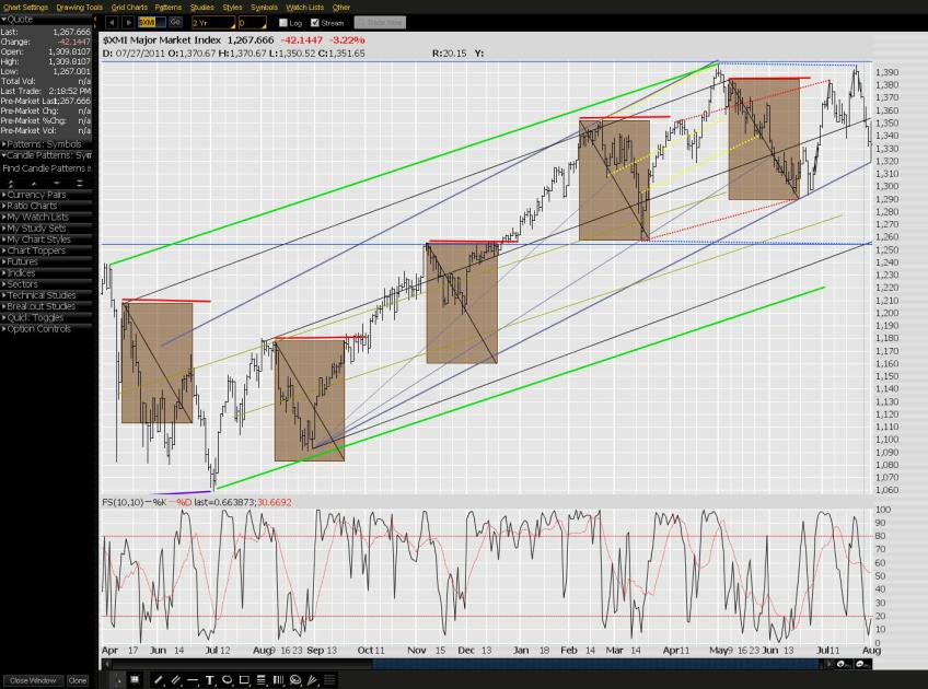 The EchoVectorVEST Forecast Model indicates clear EV topping activity present, as illustrated in the EasyGuideChart below.  On the QEVPEVs, see the 'towards flat prices, then to the downside' pivoting activity in prices as indicated by the differences in the yellow, red, and blue dotted PEVs slopes.  Note also the precipitous seasonal toppiness in both May 2010 and May 2011, and in the May Annual EchoVector, AEV (in green).  Hence the Wall street adage, "Sell in May and go away."  The brown boxes within the EchoVectorVEST EasyGuideChart illustrates the regular and successive weak QEV price periods (net sideways or down in period) observable starting with last May.  The blue PEV indicates where market prices can 'pivot' and the 'fall' too in the short run on the $XMI basis, and as 'baked into the cake' within the of the MDPP Forecast Model.