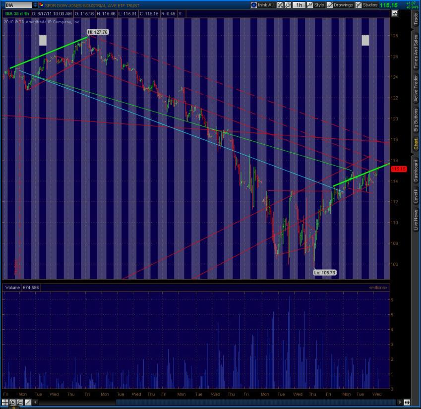 Extending the channel bottom vector from this coming Monday's '3 weeks ago' backdate (when the last sustained short-term three day rally started) through today's timeframe will yield an 'end day price equivalency low' (EDPEL) on the DIA for today at about $111.30.